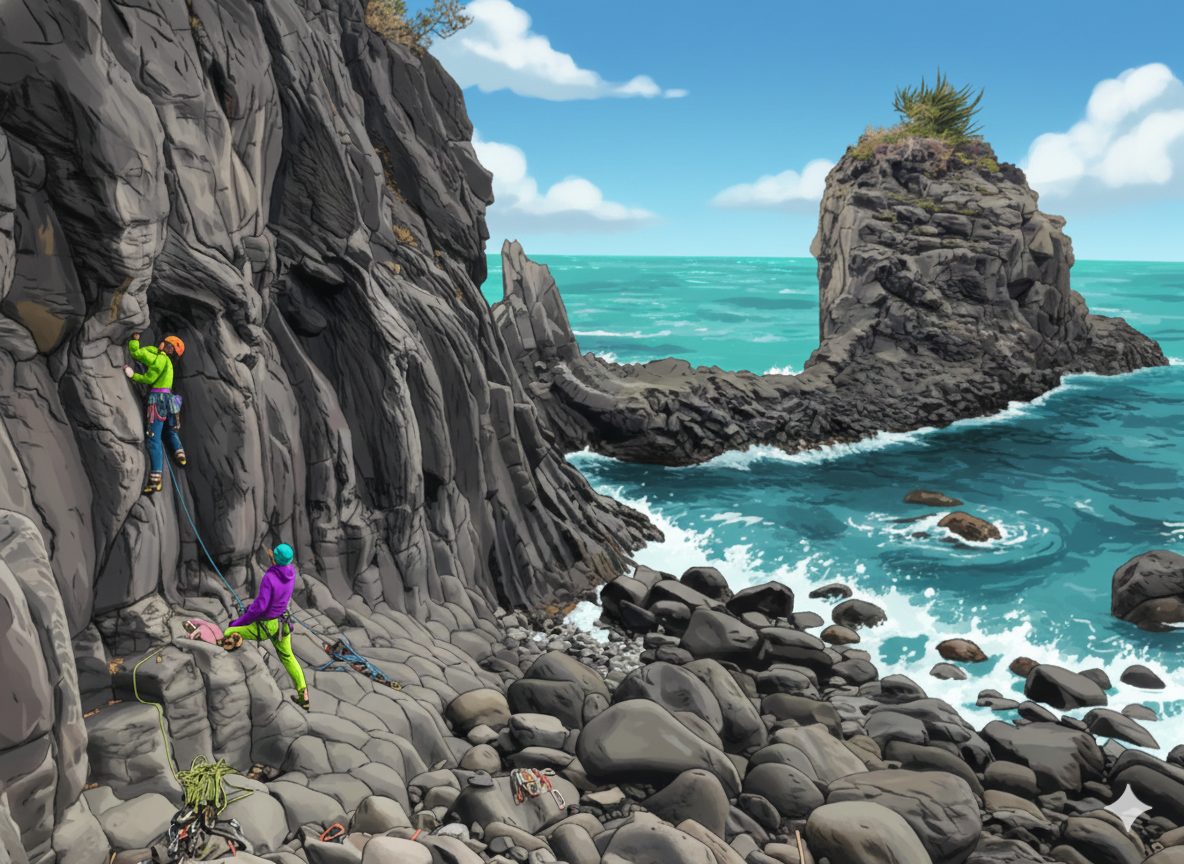 ここも大室山溶岩。伊豆高原の「大淀・小淀」は、大室山の噴火によって流れ出た溶岩が海に冷え固まり、長い年月の波による浸食で形成された独特の海岸地形。大小の岩場に澄んだ海水が入り込み、潮の干満により景観が変化します。溶岩の黒と海の青が対照的に広がる自然景勝地で、地質学的にも貴重な場所として知られています。